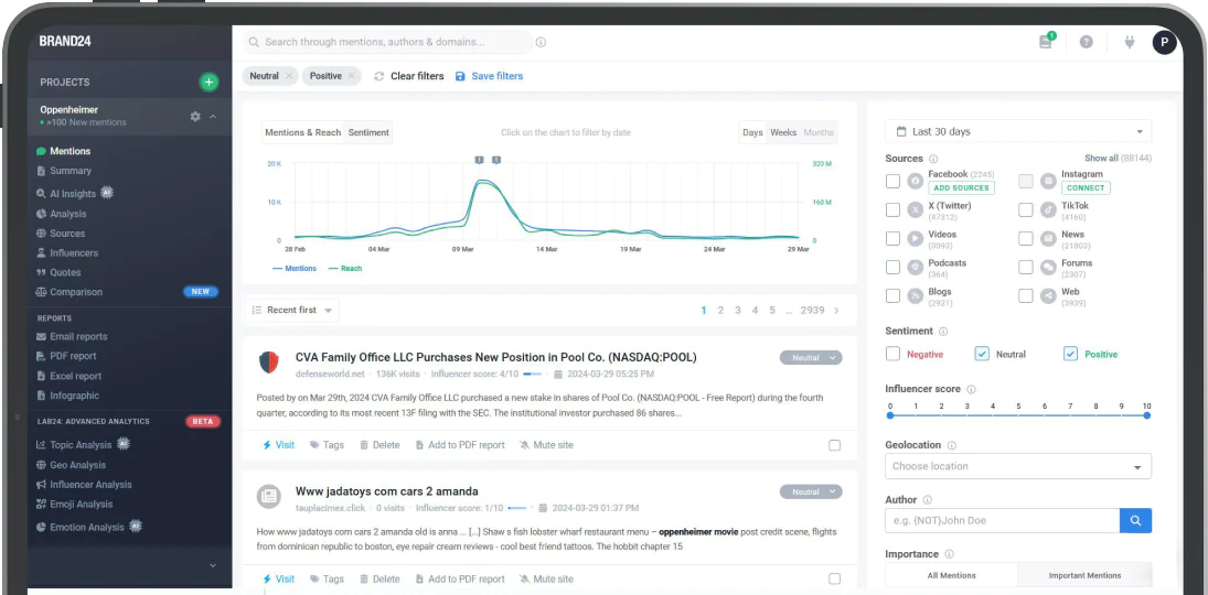 See the social media reach of your hashtags, sentiment, the number of mentions of your company name, identify the most influential sources talking about your keywords and more!