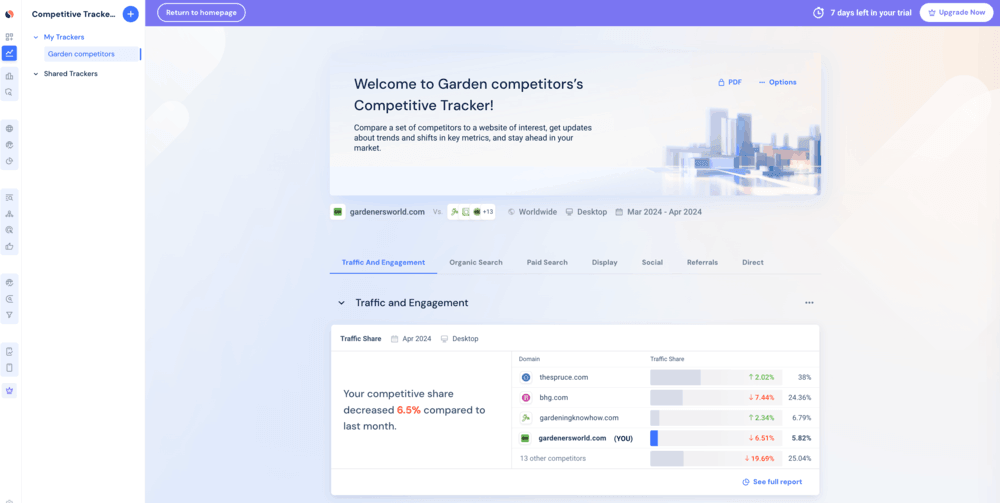 The free version of Similarweb works best for quick competitor checks and channel-level insights. It is a great tool for small companies with a tight budget for competitor monitoring tools.