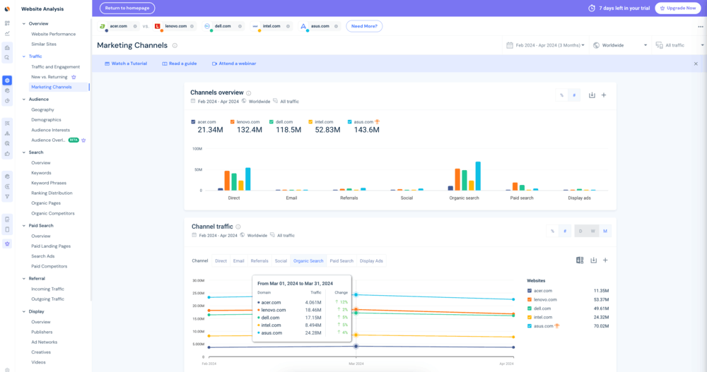 With this feature, you can see the differences between you and your competitors based on traffic sources.