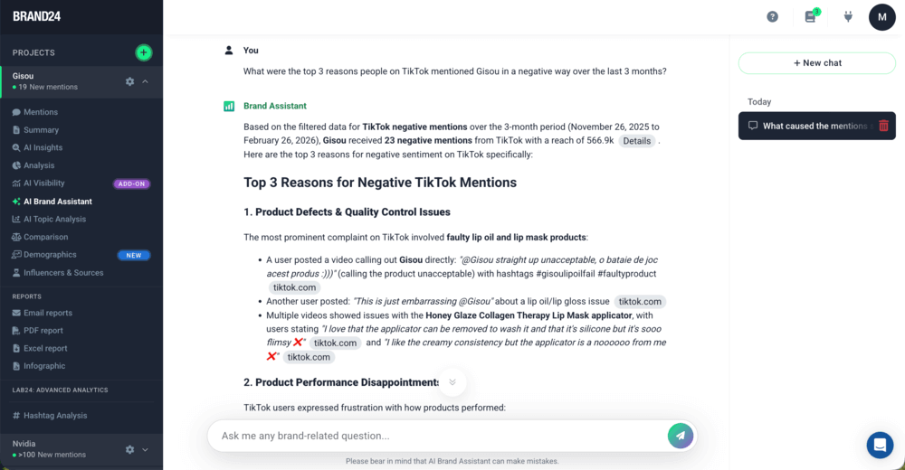 Brand Assistant analyzes your mentions and gives you a structured answer based on real data from your project.