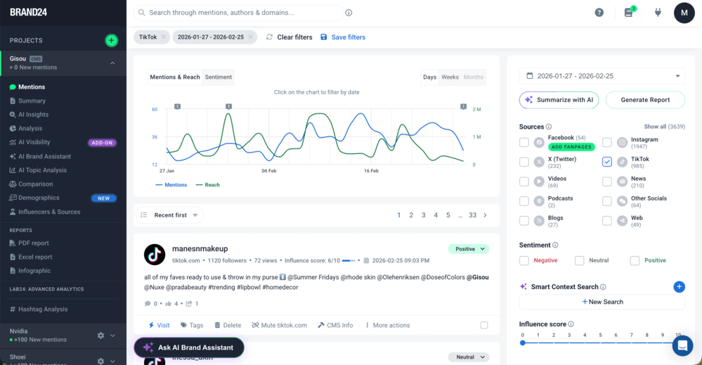 Here’s how to check TikTok sentiment in Brand24. We’ll use Gisou (a haircare brand) as an example.