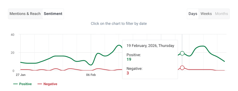 - Use the sentiment chart and manually compare the number of negative mentions vs. positive ones:
