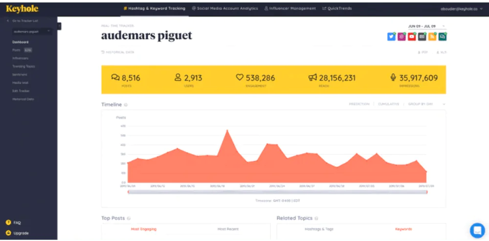Keyhole interpreta estadísticas e índices en tiempo real. Es una palabra clave y hashtag rastreador.