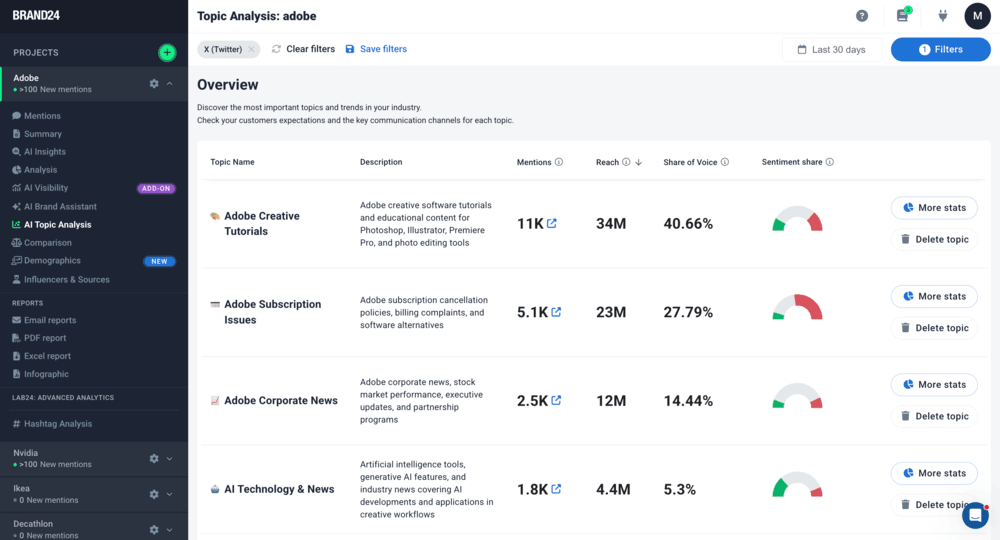 Brand24 es una empresa escucha social que te permite seguir las conversaciones sobre X en tiempo real y ver qué las impulsa.