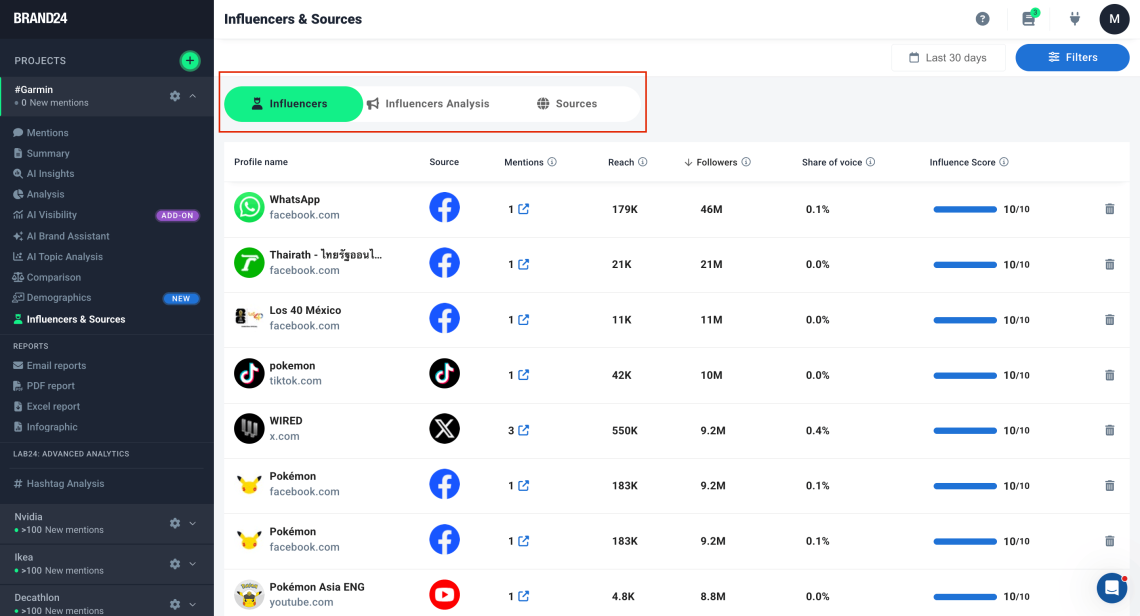 Después de iniciar sesión en su proyecto en Brand24, diríjase a la sección Pestaña Influenciadores y fuentes. Allí verás varios tipos de datos: