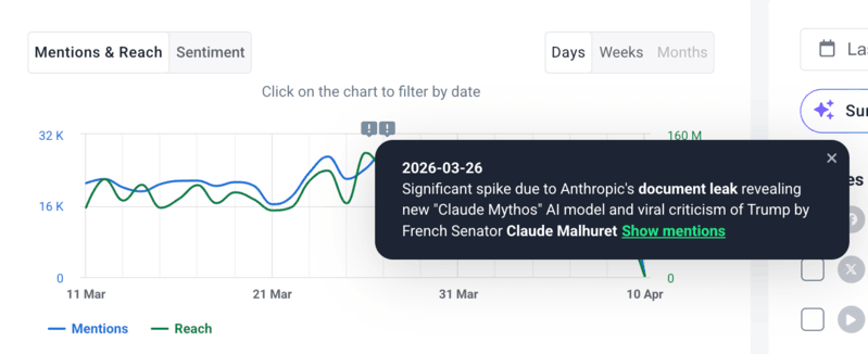 Si los mention se disparan de repente y el sentimiento general se vuelve negativo, eso es a menudo una señal de que podría estar gestándose un problema de relaciones públicas. Vigile de cerca esas métricas para poder responder antes de que la prensa se entere.