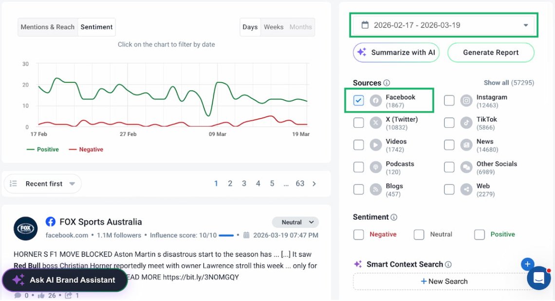 Once mentions are ready, apply the Facebook filter in the Sources panel to focus exclusively on Facebook data. You can also filter by sentiment, language, geolocation, and more.