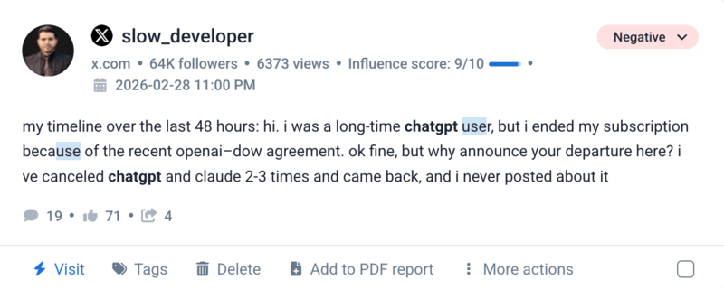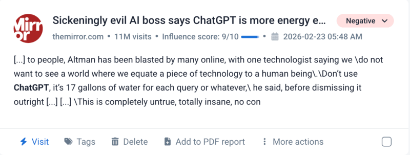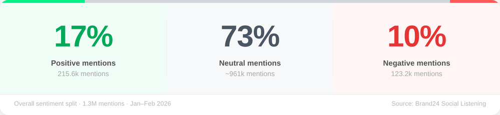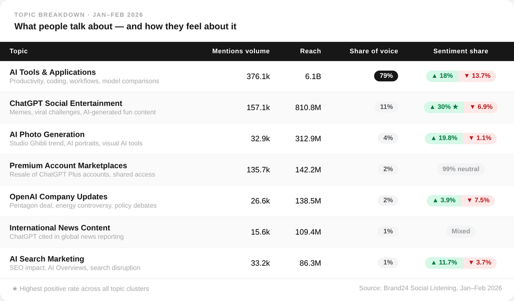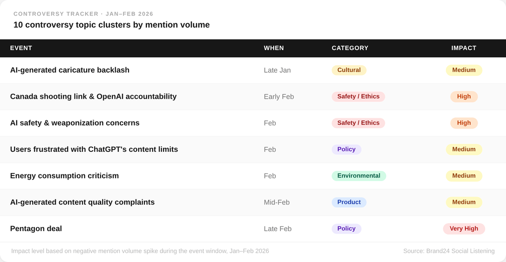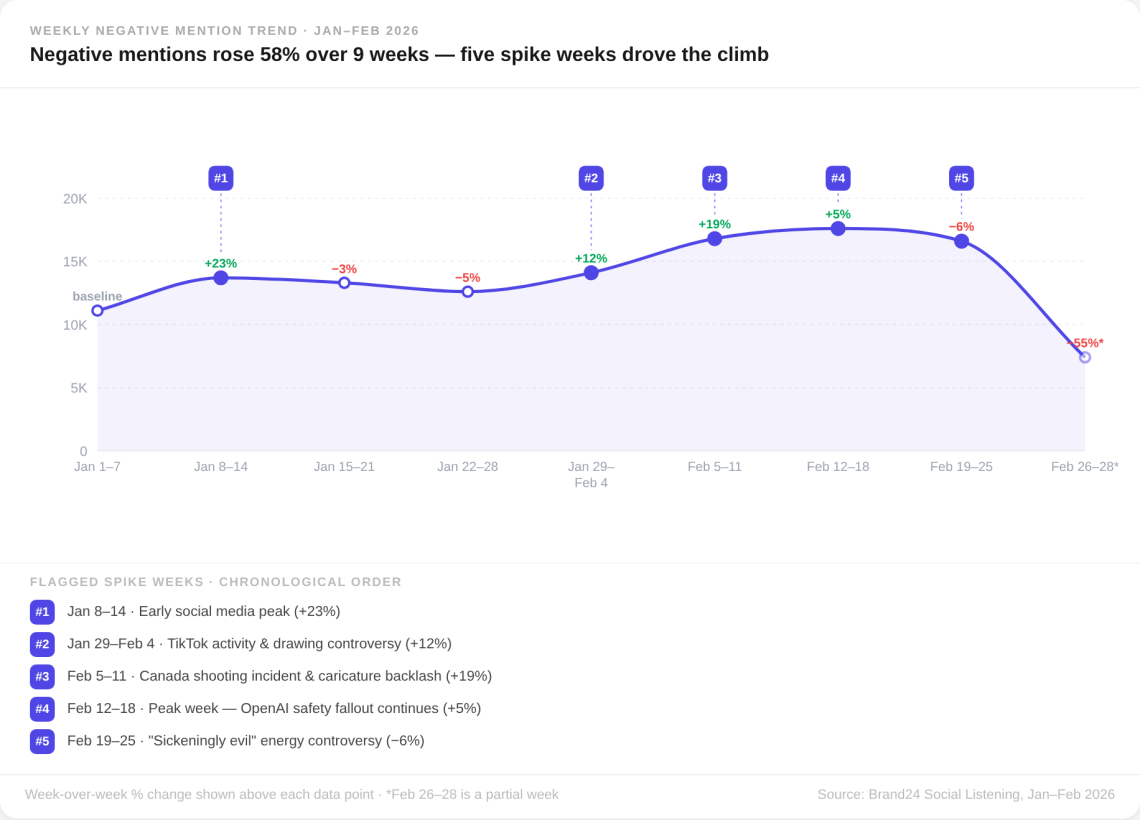 Les pics les plus importants de marques négatives mention cette année se sont produits en raison des choix d'OpenAI, comme les offres du Pentagone ou l'annonce de nouvelles politiques publicitaires. Les gens se sont également plaints du produit, mais ces plaintes étaient généralement moins intenses.