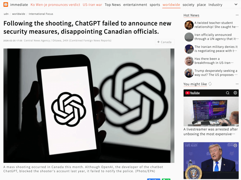 Il s'agit de l'événement controversé le plus important de l'ensemble des données. Le compte ChatGPT d'un tireur de Colombie-Britannique a été fermé pour violation des règles, mais OpenAI n'a jamais prévenu les forces de l'ordre.