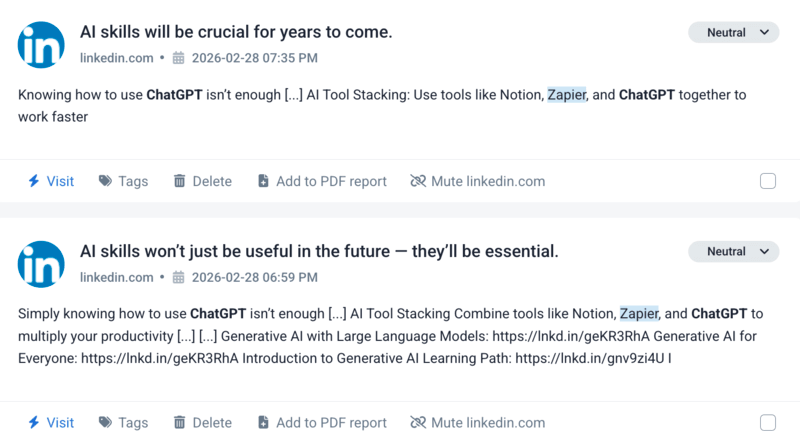 La plupart des mention de ChatGPT (73%) sont plutôt neutres. C'est ainsi que la plupart des gens en parlent en ligne : en partageant simplement des informations comme :