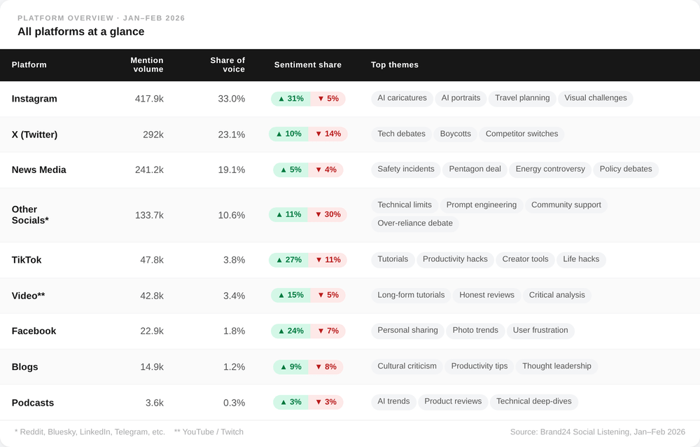 TikTok a la part de sentiment positif la plus élevée (27,4%) et Instagram génère la plus grande part de marque positive mentions pour ChatGPT.