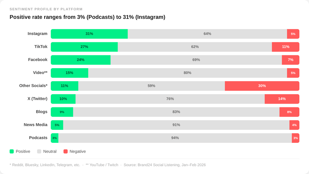 Et c'est quelque chose qui devient très clair lorsque l'on regarde la surveillance des médias sociaux et de décomposer le sentiment de la marque mentions par source :