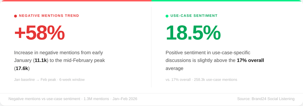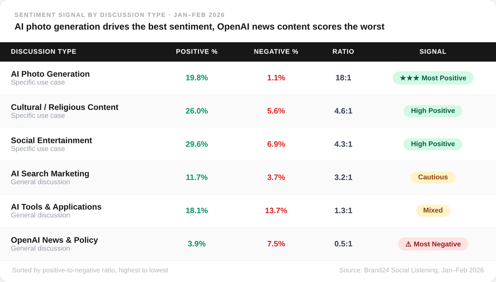 Ce que nous avons trouvé : Près de 8 fois sur 10 (79%) mentions de ChatGPT se concentrent sur des cas d'utilisation réels, et ces discussions pratiques génèrent 4 à 18 fois plus de sentiments positifs que le bavardage général sur l'IA.