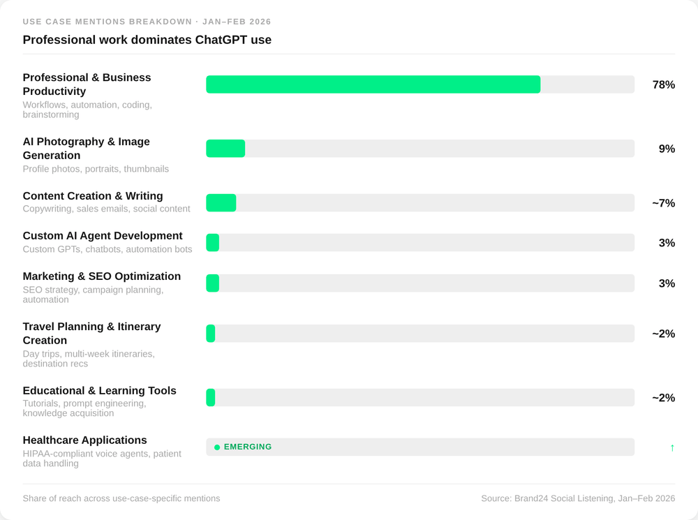 Les gens utilisent principalement ChatGPT pour améliorer leur vie professionnelle de cette manière, ce qui apparaît très clairement dans les résultats de l'écoute sociale :