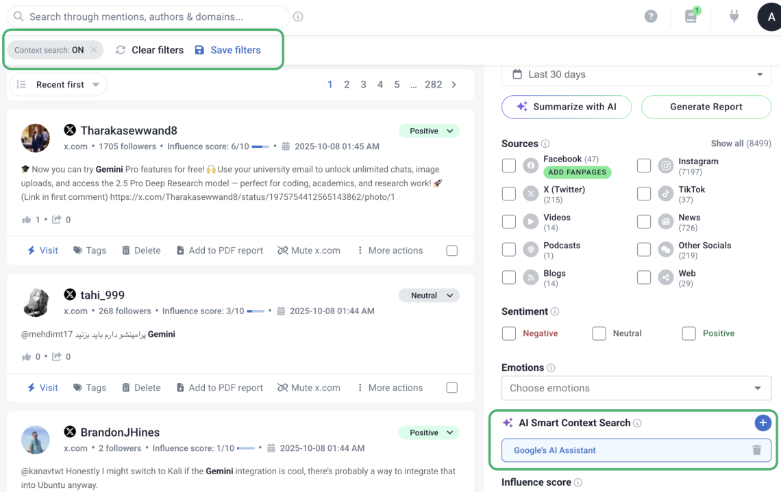 - Summarize with AI: Context Search works seamlessly with Brand Assistant, so summaries reflect only the filtered mentions.