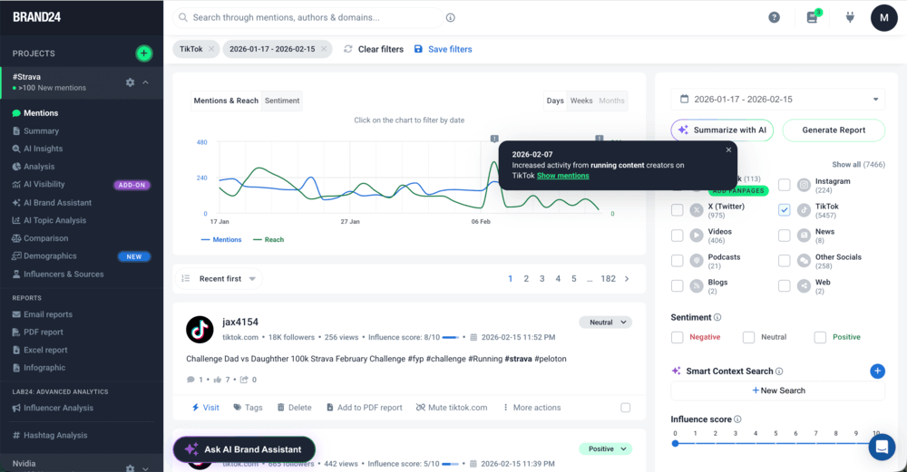 Dans la capture d'écran ci-dessous, vous pouvez voir qu'au cours des 30 derniers jours, il y a eu 5457 TikTok mentions dans le projet Strava. Vous pouvez les parcourir dans l'onglet Mentions, à l'aide de différents filtres :
