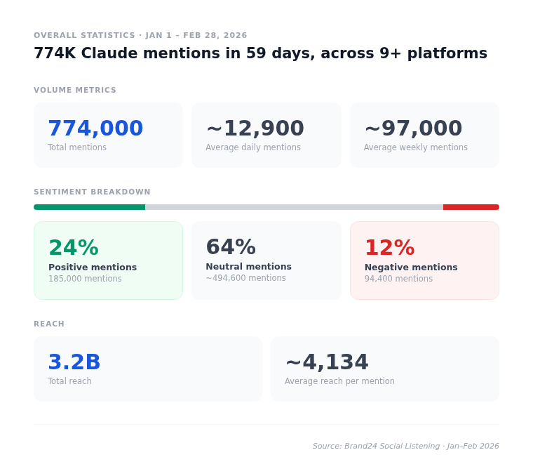 In the first two months of 2026, people posted about, shared, debated, and reacted to Claude and Anthropic 774k times in social and non-social media. That’s 12.9k per day, with a 97k per week on average.