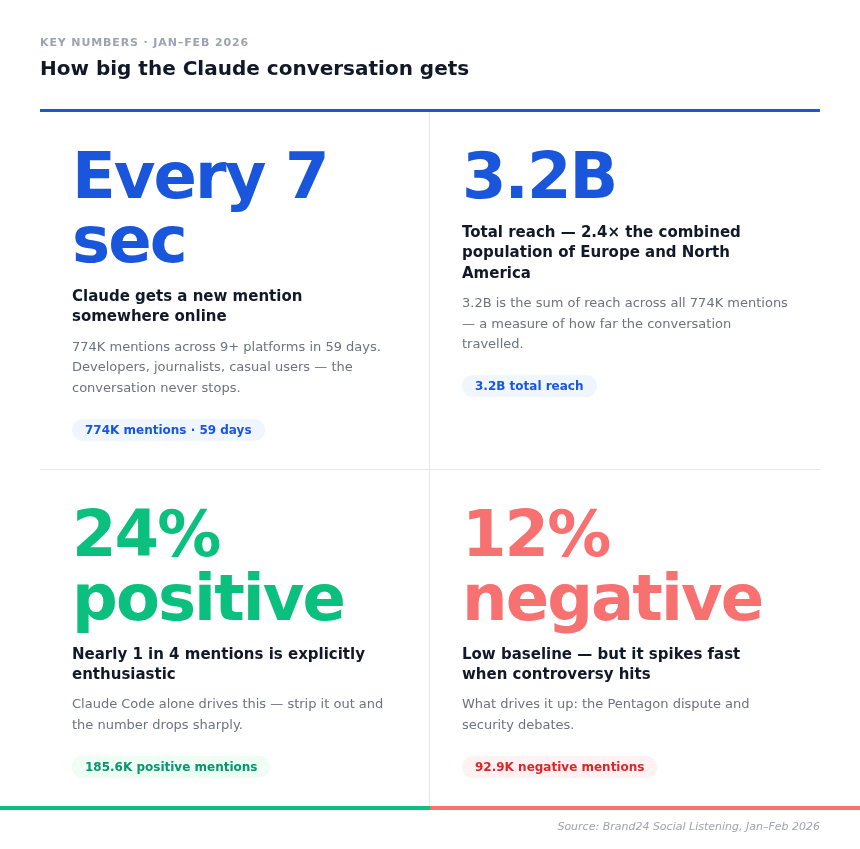 Claude mentions got 3.2 billion total reach in 60 days. To put that in perspective: Claude’s combined mention reach during January and February 2026 is larger than the population of Europe and North America combined!