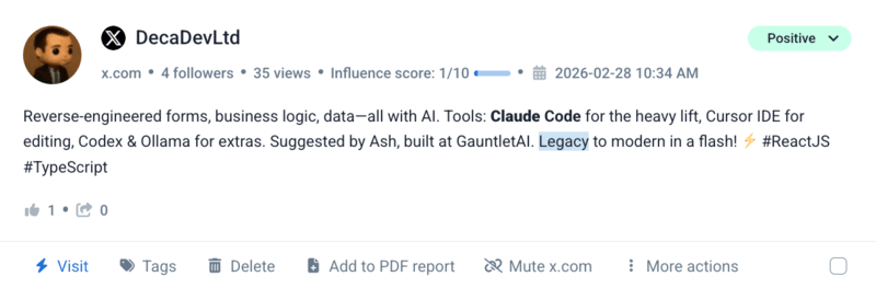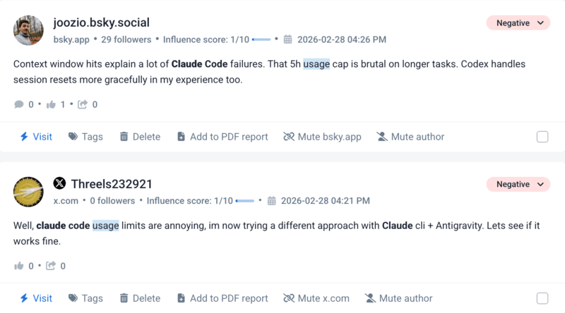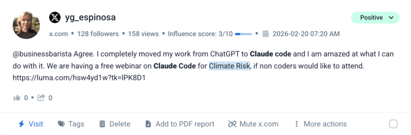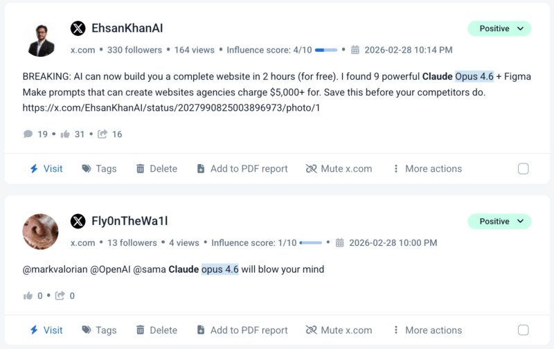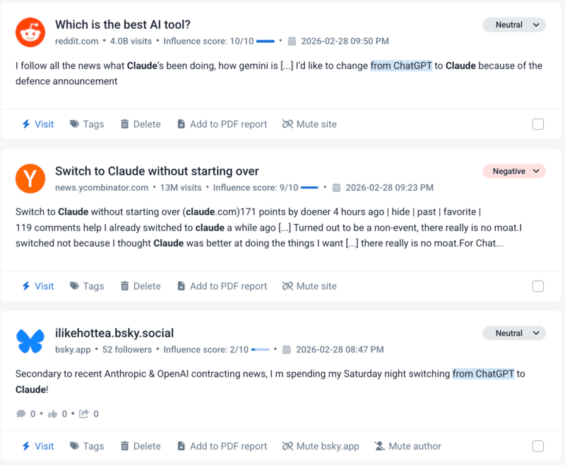 Some of the strongest positive Claude mentions were users explaining why they left ChatGPT. Those posts spread with zero paid distribution. Set up media monitoring project on your top competitors combined with words like "switching," "alternative," "tired of," and "cancelled." When those mentions spike, that's your window.