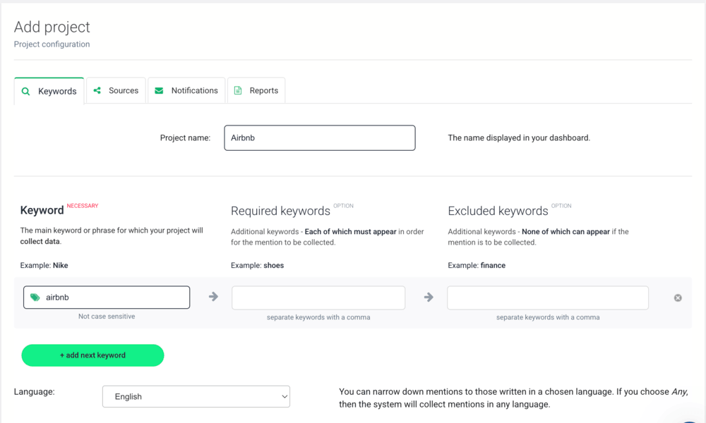 Se a configuração da palavra-chave for muito ampla, você coletará muitos mentions irrelevantes do tópico. Por outro lado, se for muito restrita, você perderá palavras importantes.