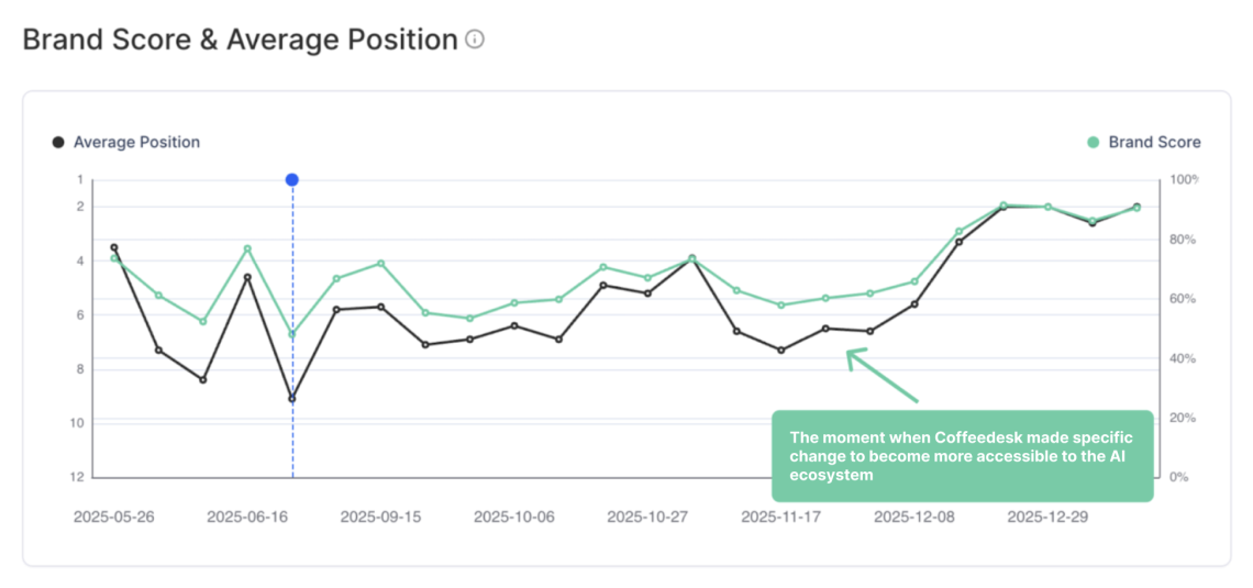 • A Coffeedesk observou que a parte de descoberta da jornada do consumidor está mudando para respostas de IA - muitas vezes sem nenhum clique. Isso os levou a perceber que sua visibilidade poderia aumentar mesmo que os números de sessão e atribuição permanecessem estáveis.