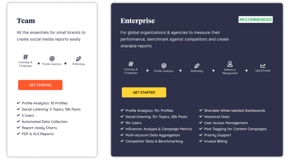 | Melhor para | Equipes focadas em campanhas de mídia social, rastreamento de hashtag e análise de perfil | Equipes de médio porte e de empresas que executam monitoramento de marca, RP e reputação |