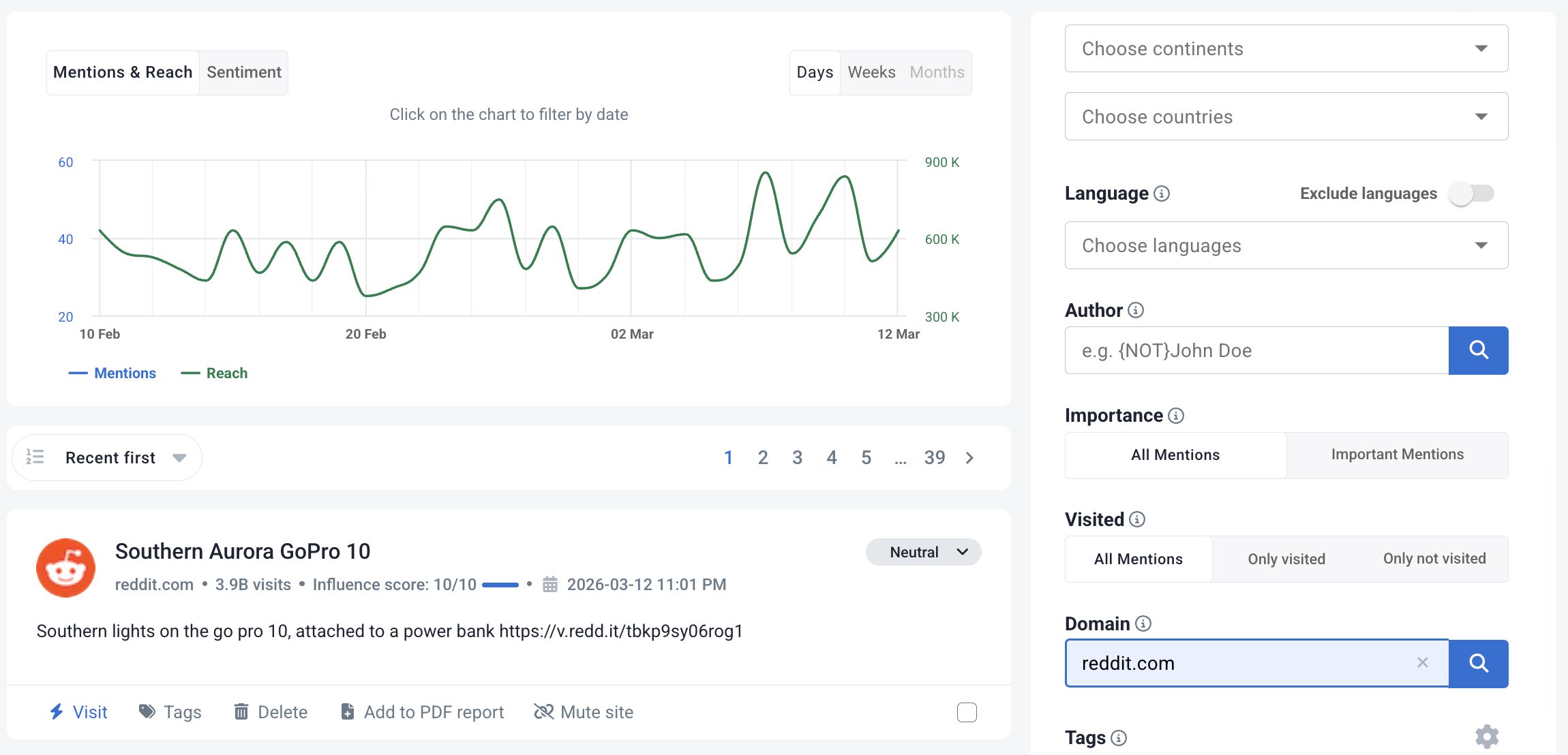 Você pode filtrar os resultados para ver apenas os Reddit mentions.