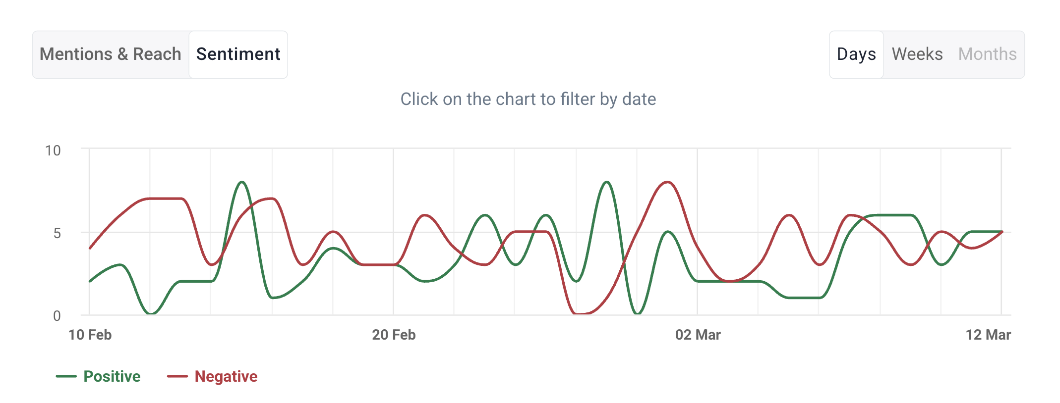 Você também pode alterar a visualização para o gráfico Sentiment. Ele mostra a distribuição de mentions positivos e negativos de um determinado período.