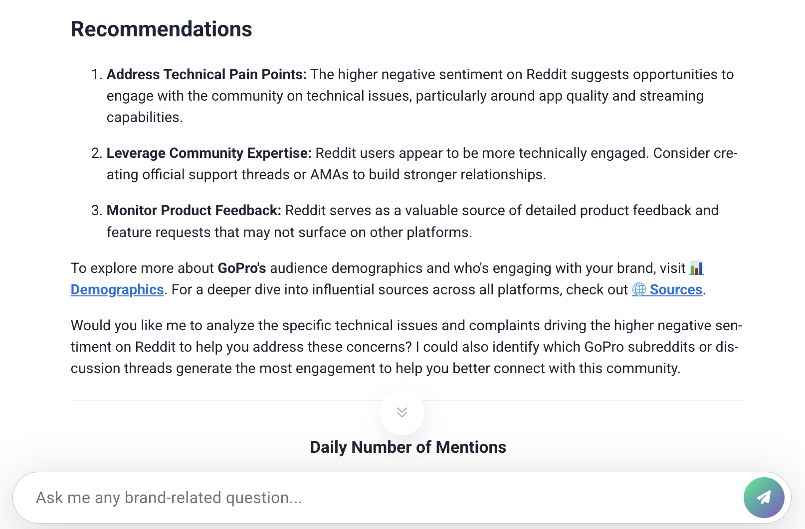Por exemplo, o Assistente de marca com IA pode analisar grandes volumes de mentions e resumir rapidamente o que as pessoas estão dizendo sobre sua marca, produto ou tópico.