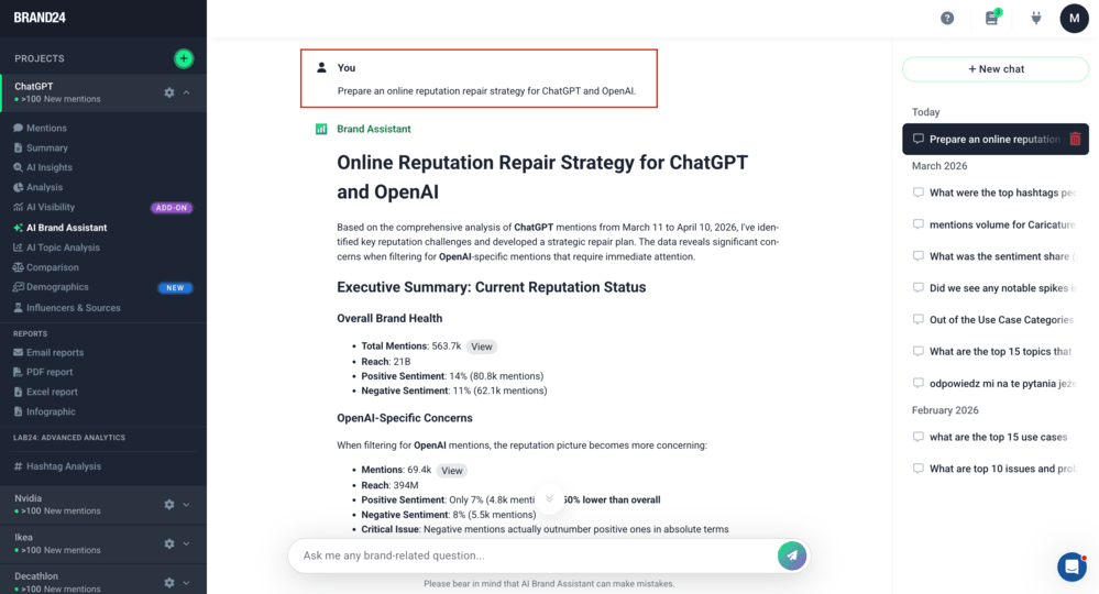 Digite um prompt como em qualquer outro chatbot de IA, por exemplo: Preparar uma estratégia de reparo da reputação on-line para o ChatGPT e a OpenAI.
