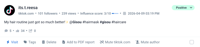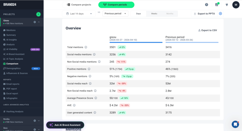 Como você pode ver, a marca de beleza viral do TikTok, Gisou, obteve 2% a mais de mentions de 27 de março a 10 de abril em comparação com o período anterior.