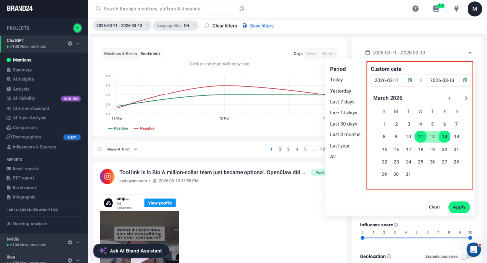 Uma ferramenta de monitoramento de mídia como a Brand24 facilita isso: basta escolher os períodos de tempo que deseja analisar e ela obterá os insights para você.