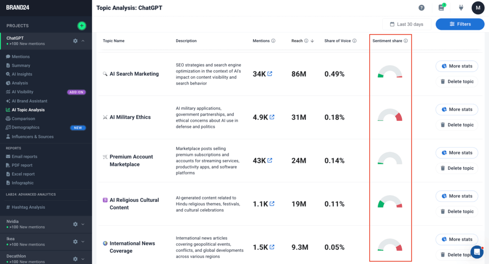 Como você pode ver, “AI Military Ethics” tem um sentimento fortemente negativo e representa 0,18% de todos os tópicos relacionados à OpenAI nos últimos 30 dias.